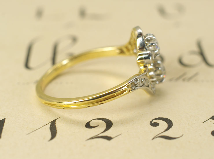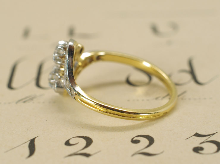 リング外側にフランスの18金のホールマーク(鷲の頭)入り。アンティーク18金トワエモアダイヤモンドリングは良い状態です。