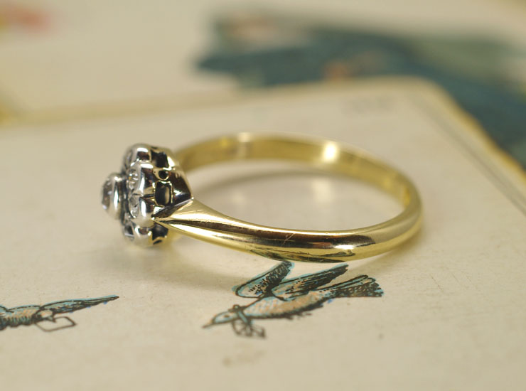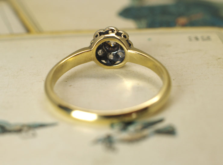 地金は花部分はプラチナでリング全体は18金。ややトーンの淡い優しいイエローゴールド。美しいアンティークデイジーダイヤリングです。