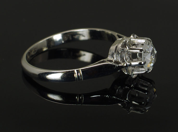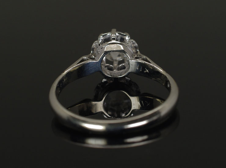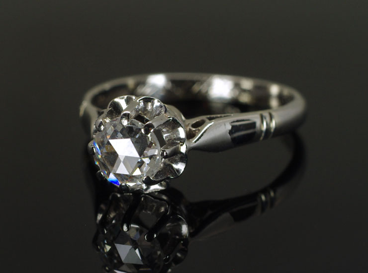 1920年-1930年頃のアンティークダイヤリングです。ローズカットのダイヤは直径5ミリ(完全な円形ではないため大体のサイズ)と大粒で、キラキラと絶え間なく光を放ち続けます。透明度も高く遠目にも目立ちます。地金は18金ホワイトゴールド。