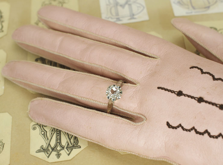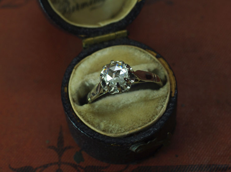 ハンドカットのダイヤモンドですので、機械でカットしたような完璧な形ではなく、端がわずかにゴツゴツとしたラフなカットですが、肉眼ではまったく分かりません。(赤の矢印で示した箇所)。リング内側に手彫りでメッセージが彫られていますが何と彫られているかは解読できません。おそらく婚約指輪だったのでしょう。