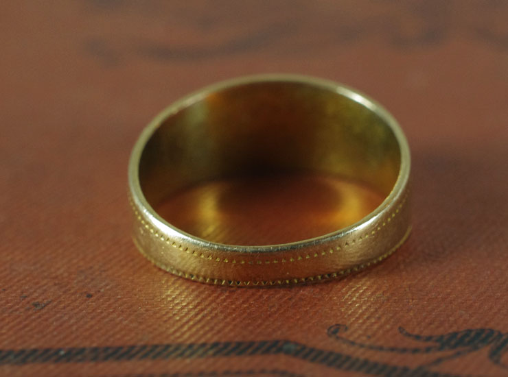 シンプルながら立体的なMIAPAHの文字が美しいヴィクトリア時代のMIZPAHリングです。地金は18金。幅は一番太い前部分が7.3ミリ、一番細い後ろ部分の幅は2.7ミリ。指なじみのよいリングで、普段使いにもぴったりの美しいアンティークリングです。