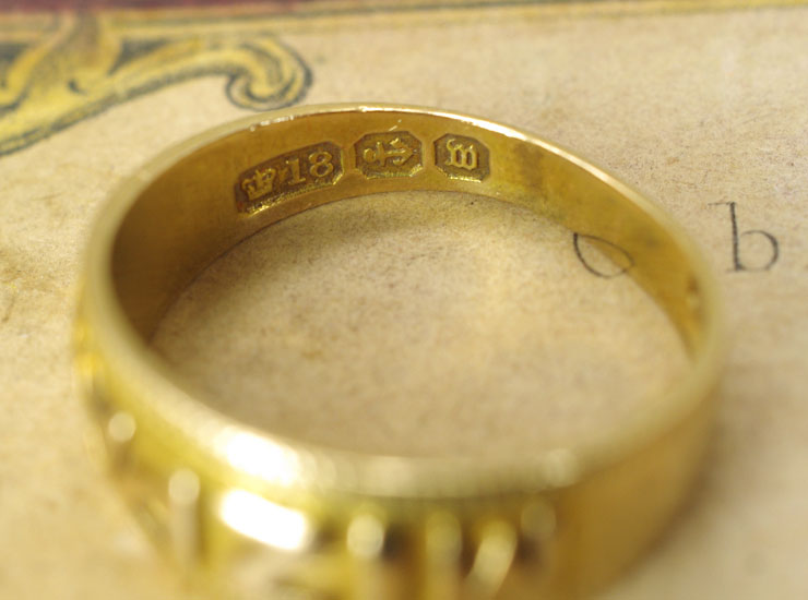 リング内側に18金、1896年を示すイギリスのホールマーク(刻印)入り。アンティーク18金MIZPAHリングは良い状態です。