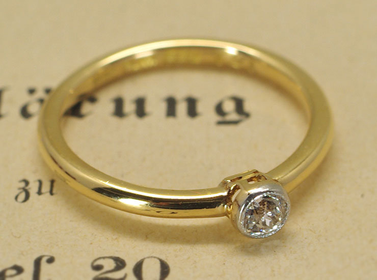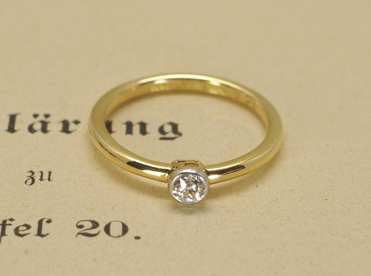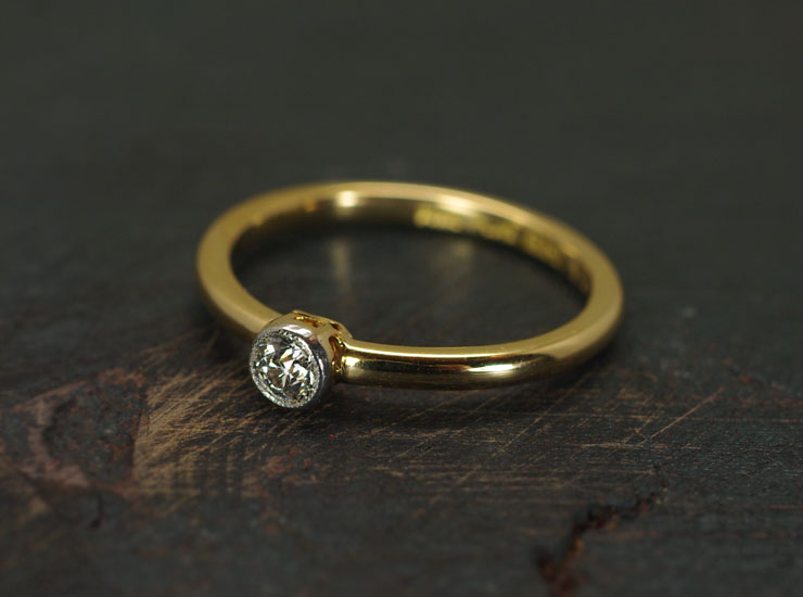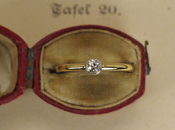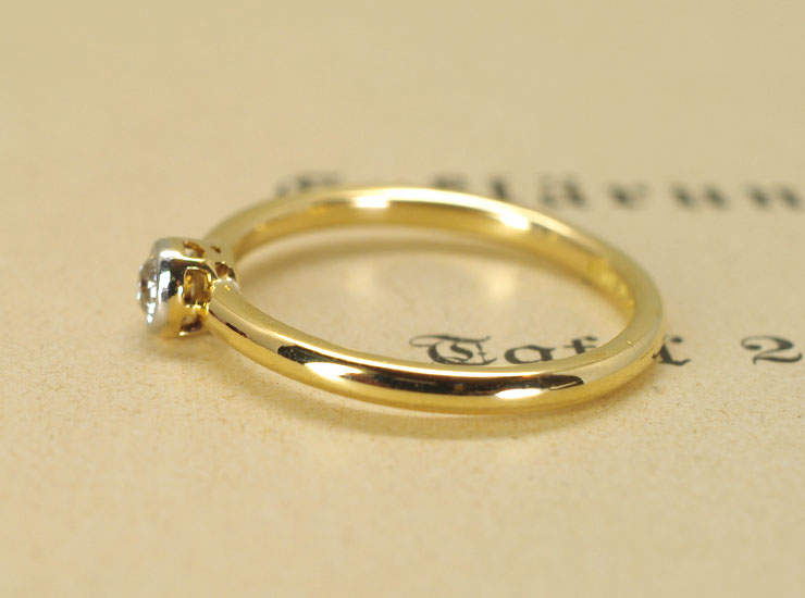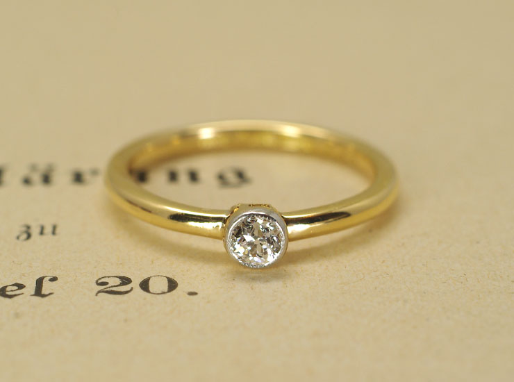地金はダイヤの周囲のベゼルのみプラチナで、リング全体は18金イエローゴールド。上質なダイヤが使用されたシンプルで美しいアンティークリングです。