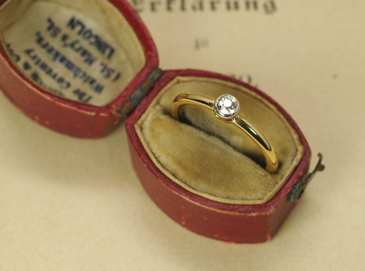 1910年頃のイギリス製アンティークリングです。透明感溢れる素晴らしい輝きのオールドヨーロピアンカットダイヤモンドがシンプルに一石。薄暗い部屋の中の僅かな光さえ捉えてキラキラと煌めきます。ダイヤの大きさは3.5ミリ。リングはほっそりと華奢に見えますが、実際につけてみると意外と厚みがありしっかりとした作りで安心感があります。ダイヤは地金で包んだ覆輪留めで、引っかかりの少ないデザインです。