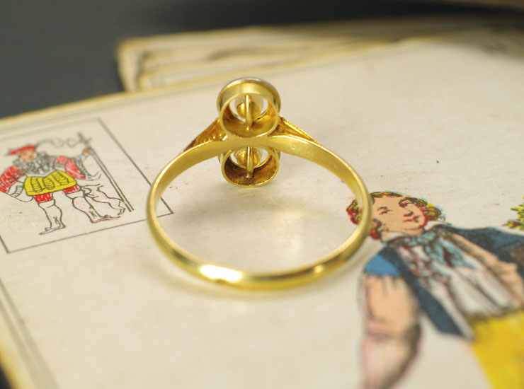 リングにフランスの18金のホールマーク(鷲の頭)、メーカーマーク入り。アンティーク18金シードパールリングは良い状態です。