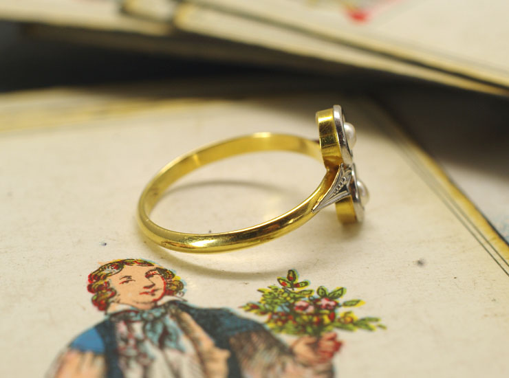 地金は18金ホワイトゴールドと18金イエローゴールド。リングは使用感が非常に少なく、細かな装飾も擦れてなく綺麗に残っています。小さなリングがこれほど良い状態で残っていることは希です。気品のある可愛らしいアンティークリングです。