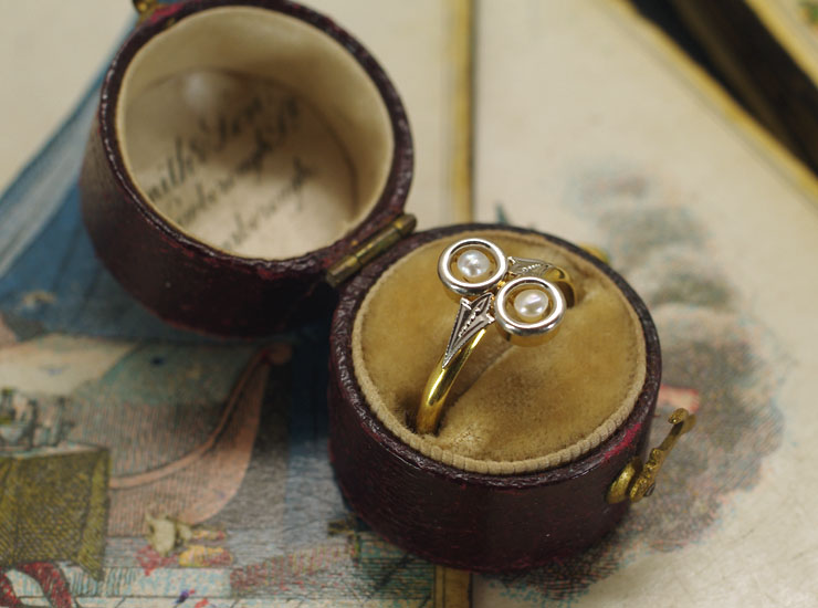 1910年頃のフランス製アンティークリングです。清らかな艶のシードパールが2粒。シードパールが縦に並んだデザインというのは意外となく、奥ゆかしい上品さの中に個性が光ります。天然のシードパールですので、完全な丸い形ではなく、いびつな自然のままの形です。シードパールの大きさは約2.7ミリ。