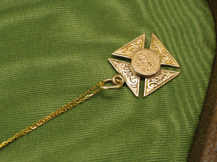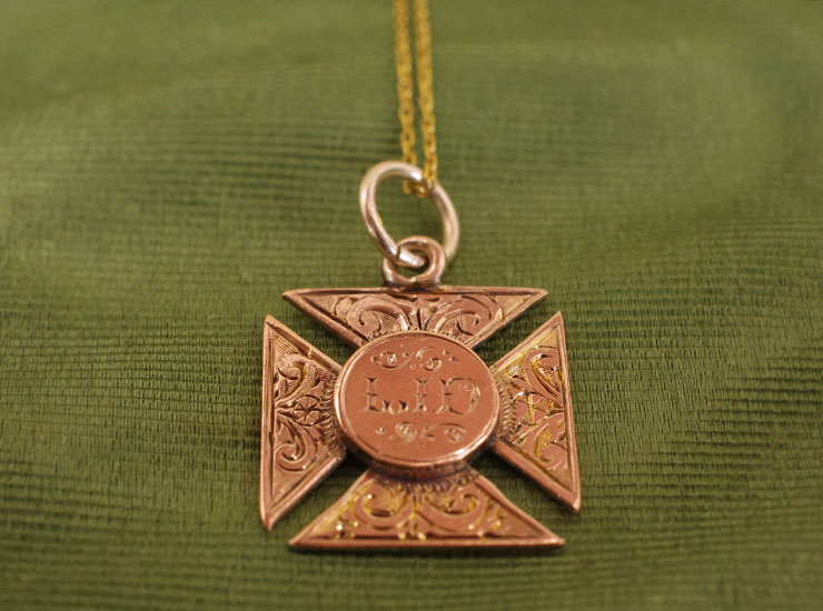 1901年のイギリス製アンティーク十字架(クロス)ペンダントです。縦と横が同じ長さの正方形フォルムに、中央は丸というちょっと変わった形の十字架。葉に花、そして中央にはイニシャルが美しく手彫りされています。彫りの陰影が立体的な表情を生み出します。ペンダントは元々男性の海中時計のチェーンに付ける飾り(フォブ)だったと思われます。地金は9金。味わい深い魅力的なアンティーク十字架ペンダントです。