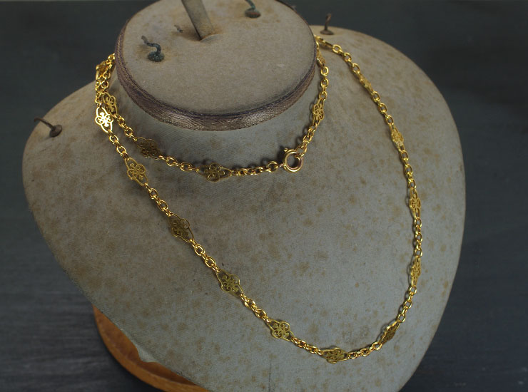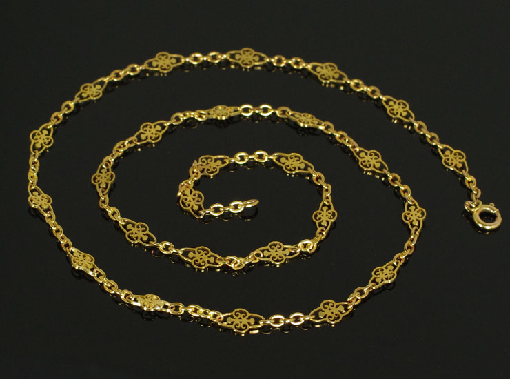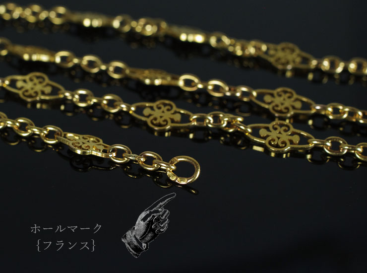 1900年頃のフランス製アンティークネックレスです。フルール・ド・リスのような透かし細工が繋げられた美しいチェーン。丁寧な細工は一目見ただけで上質なものと分かります。地金は18金。ややピンクがかったフランス製アンティーク特有の豊かな色合いの18金ゴールドです。