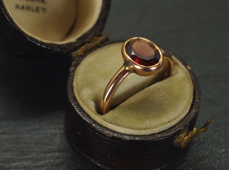1912年のイギリス製アンティークリングです。美しいガーネットのシンプルな指輪。ガーネットの色は様々で、黒っぽい色のものから、赤、オレンジ、茶色、黄緑、緑、紫と多くの種類がある宝石です。こちらのガーネットは、ロードライトガーネットと呼ばれる種類で、深い赤に紫が混ざった落ち着いた葡萄酒色です。背景が白の掲載写真では、色が薄く写っていますが、実物はもっと濃厚な色合いです。