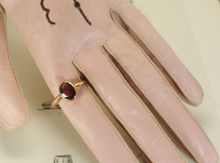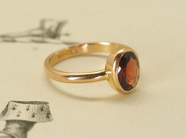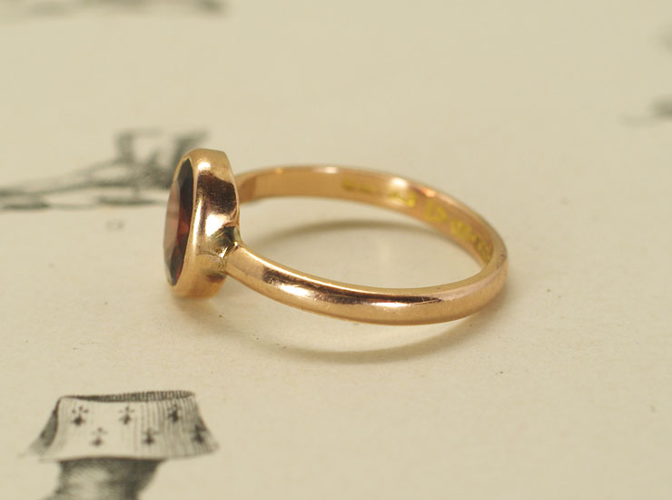 地金は15金。ピンクゴールドで、ガーネットのこっくりとした色合いに良く合います。ガーネットのサイズは縦9ミリ×横6.5ミリ。地金で包まれた覆輪留めでシンプルで引っかかりの少ないデザインです。すっきりとしたデザインにこっくり光沢のある美しいガーネットのアンティークリングです。