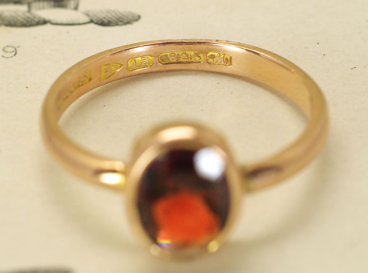 リング内側に15金、1912年を示すホールマーク(刻印)とメーカーのマーク入り。アンティーク15金ガーネットリングは良い状態です。