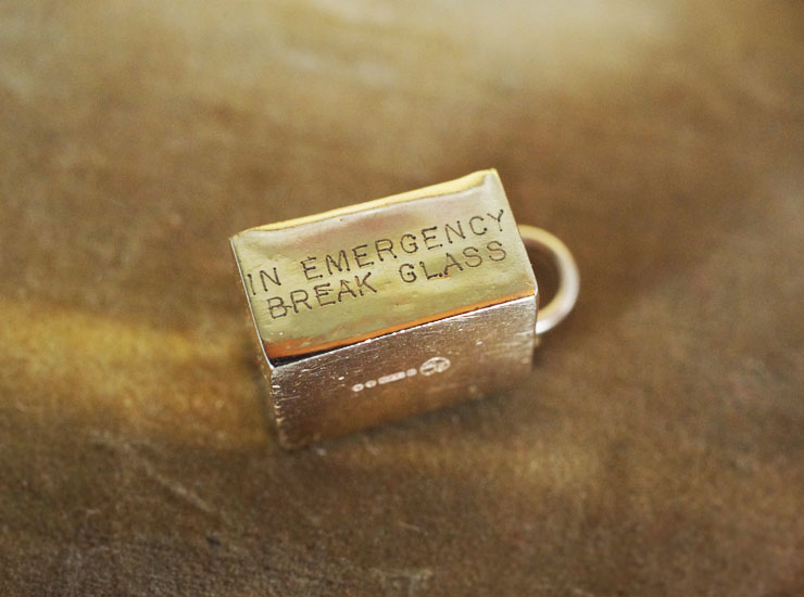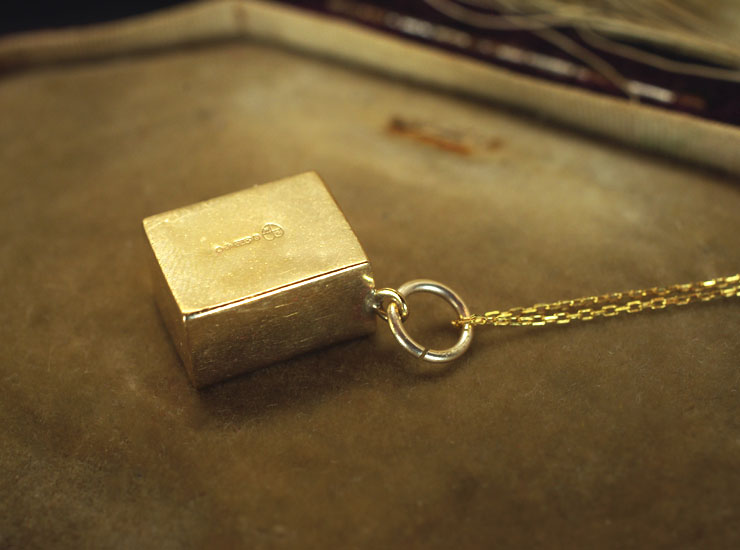 地金は9金。中は開けることができない作りですので、紙幣を取り出すのは、刻まれたメッセージ通りガラスを割るしかありません。つけていると話題になりそうなユニークで可愛らしいヴィンテージチャームです。※最後のチャームが2つ写っている写真は右のチャームが当商品です。