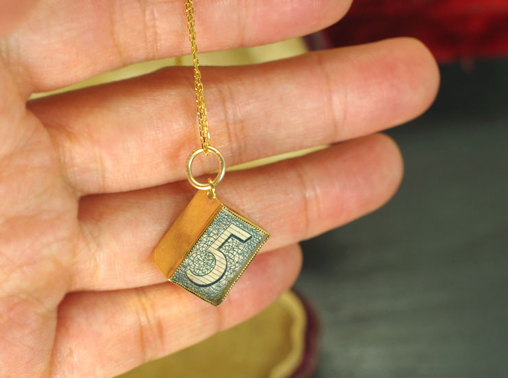 1965年のイギリス製ヴィンテージチャームです。ゴールドのボックスに入っているのは古い5ポンド紙幣。前面にはガラスが入っていて、「5」の数字の形がなんとも可愛らしく洒落ています。ボックスのサイドには「IN EMERGENCY BREAK GLASS」(緊急時にはガラスを割れ」と刻まれています。もしもの時のお金が可愛らしくペンダントになっています。※5ポンド紙幣は本物かどうかは確認しておりません。