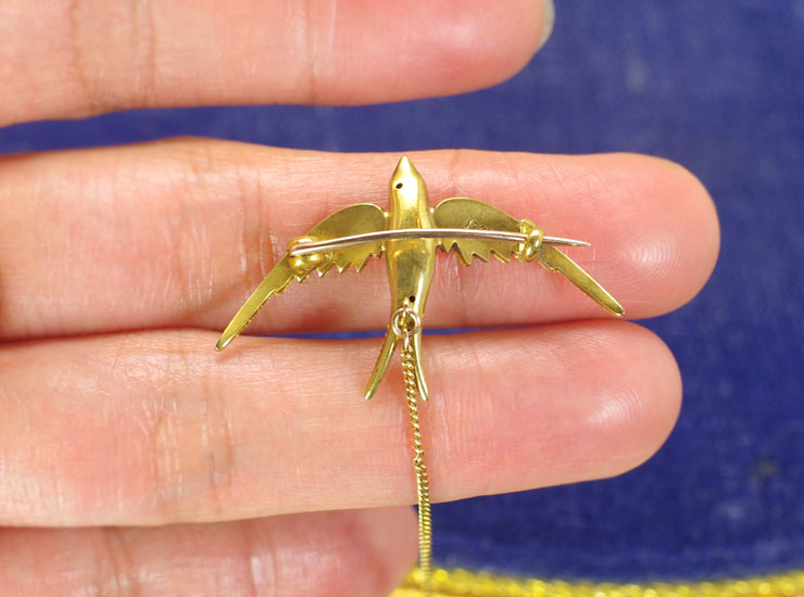ブローチの地金は15金。(セーフティーチェーンのみ9金)。以前はこのようなツバメの体全体のブローチは年に数回見かけたのですが、残念ながら最近ではすっかり見かけなくなってしまいました。次はいつ出会えるか分かりません。お探しの方はぜひご検討ください。小さな宝物となることでしょう。