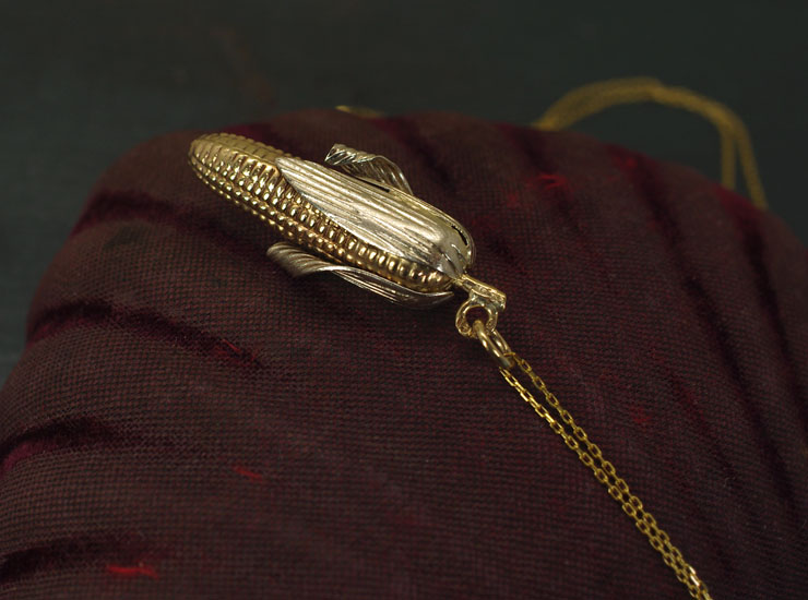 1975年のイギリス製ヴィンテージとうもろこしチャームです。コーン一粒一粒のプチプチとした質感やくるりとめくれた皮など、とうもろこしがリアルに表現されています。地金は9金で、皮の部分はほんのりグリーンのゴールド、コーンの部分はイエローゴールドが使用されています。中が空洞の作りですが、サイズが縦29ミリ×横18ミリと大きめのサイズで重量が3.8グラムもあります。とうもろこしがモチーフのゴールドジュエリーなんて他には見たことがありません。ユニークなだけではなく、細やかな作りの上質なヴィンテージチャームです。ネックレスやブレスレット以外にも、小物に付けたりアイディアしだいで色々とお楽しみいただけると思います。