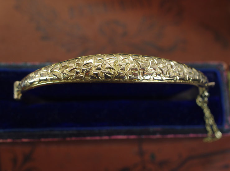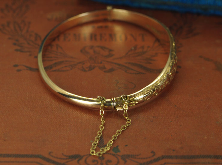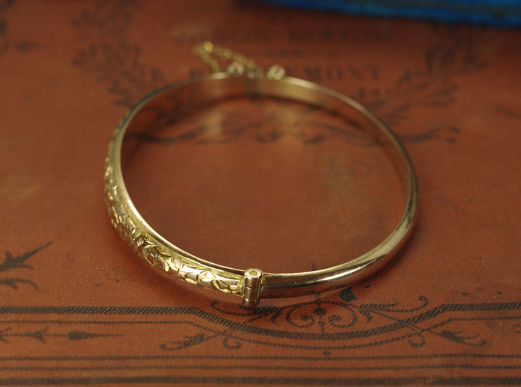 地金は9金。ピンクを帯びた明るいゴールドです。サイド部分に留め具が付いていて、その留め具を軽く押しながらスライドさせて開閉します。閉める時はカチリと音を立ててしっかり閉まります。アンティークバングルはヘコミがあるものが多く、状態のよい物は価格もかなり高額になってしまいます。この価格帯でへこみもほとんどなく、状態の良いものは滅多に見つかりません。女性らしさをひきだしてくれる美しいアンティークゴールドバングルです。