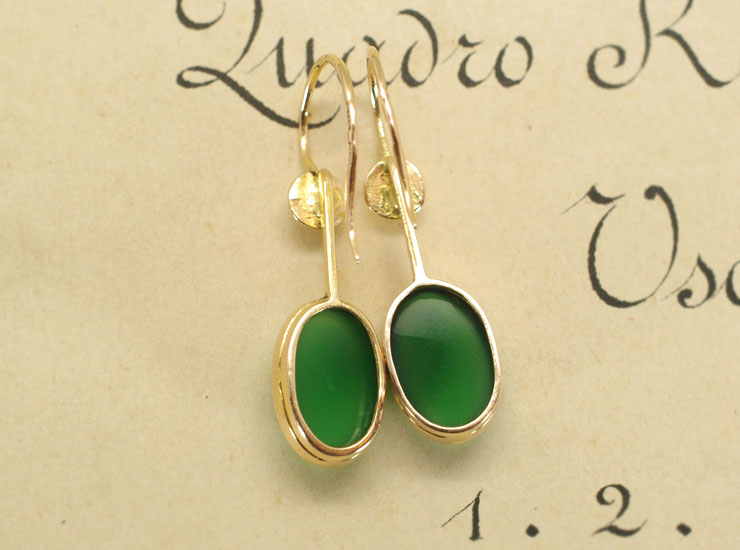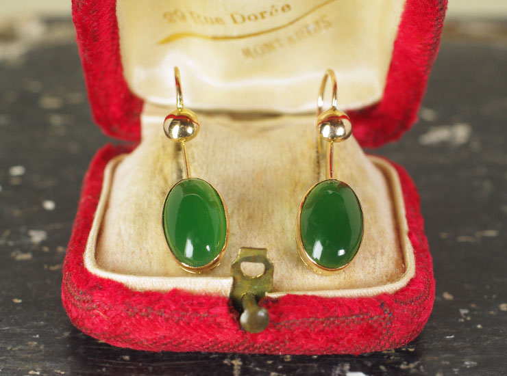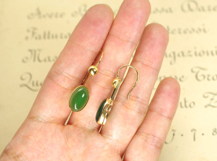地金は14金。エストニアのライオンのホールマーク(刻印)が入っています。ピアスは留め具がなく、フックを引っかけて着用します。存在感のあるサイズのピアスですが、重くはなく長時間でも快適にご使用いただけます。しっとり艶々のグリーンカルセドニーのヴィンテージピアスは使用感も少なく美しい状態です。