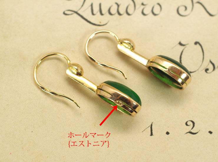 フックの部分に「585」と14金を示す刻印、メーカーのマーク入り。本体部分にエストニアのライオンのホールマーク(刻印)が一カ所入っています。ヴィンテージ14金グリーンカルセドニーピアスは良い状態です。