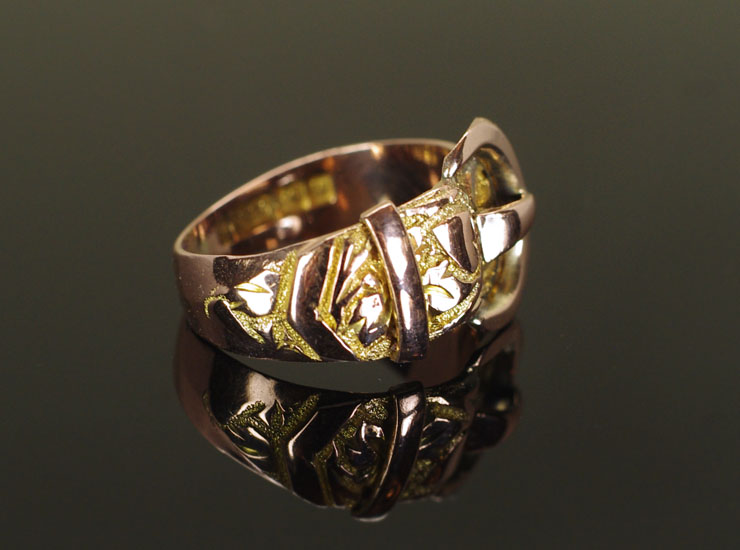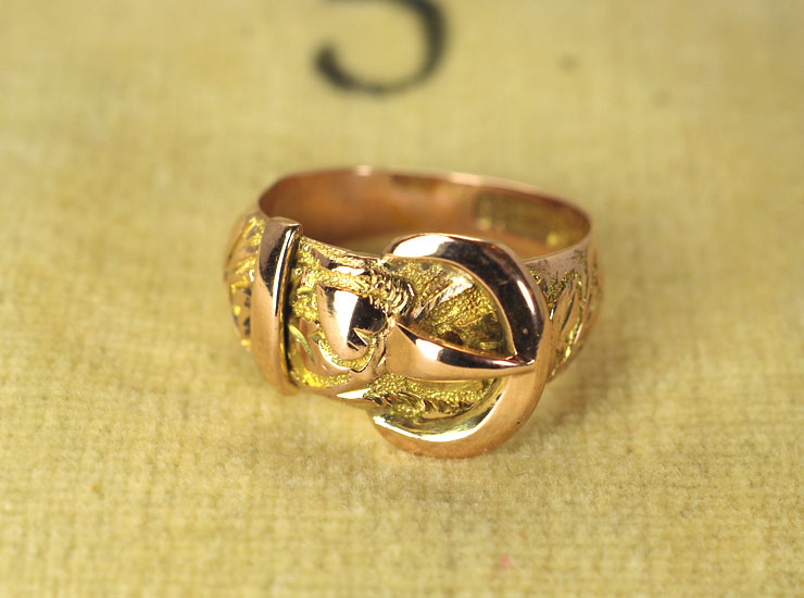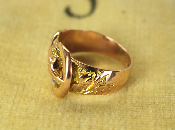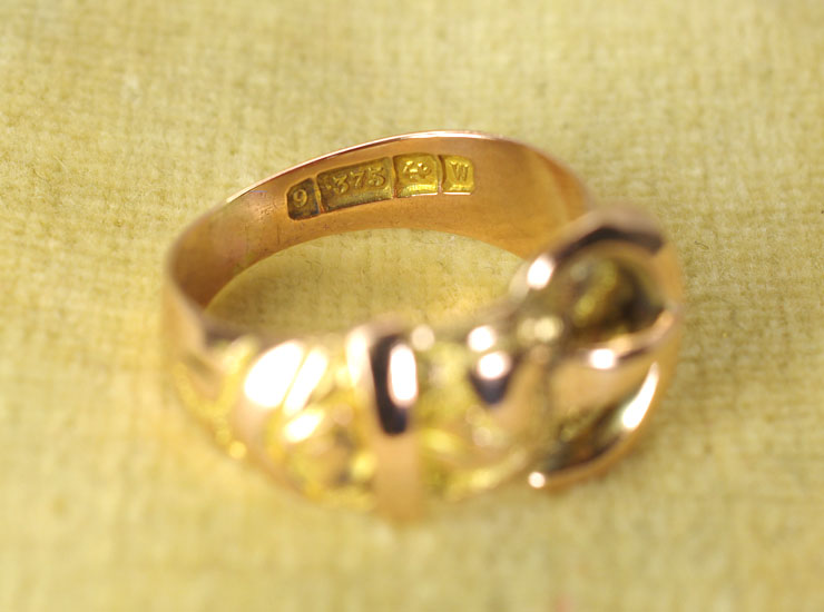 リング内側に9金、1921年を示すイギリスのホールマーク(刻印)入り。アンティーク9金バックルリングは良い状態です。