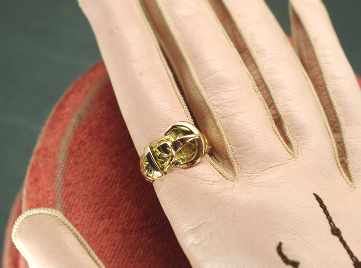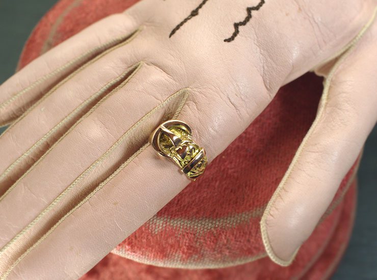 1921年のイギリス製アンティークリングです。ベルトバックルのデザインが格好いいリング。指にベルトをギュッと巻き付けたように、バックルは立体的でリアルな作りになっています。前半分には植物とハートが手彫りされていて、後ろ半分は何も彫られていないプレーンなデザイン。リングの幅は一番太いところで12ミリと幅広のデザインですので、実際のサイズよりも1号〜1.5号程度小さく感じられる方が多いと思います。地金は9金。ピンクを帯びた肌なじみのいいゴールドです。元々は男性用のリング(おそらくピンキーリング)ですが、サイズが小さめですので格好いいアンティークジュエリーをお探しの女性の方にもお勧めのリングです。