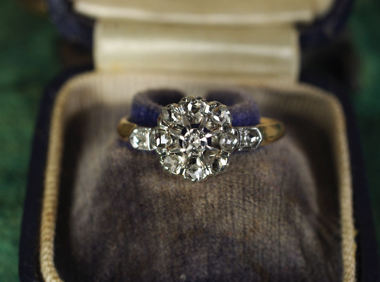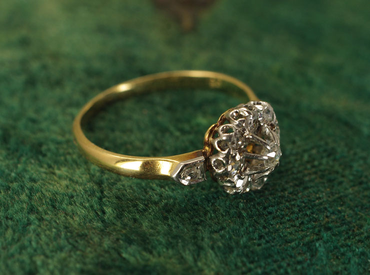 リング外側にフランスの18金のホールマーク(鷲の頭)入り。アンティーク18金ダイヤモンドクラスターリングは良い状態です。
