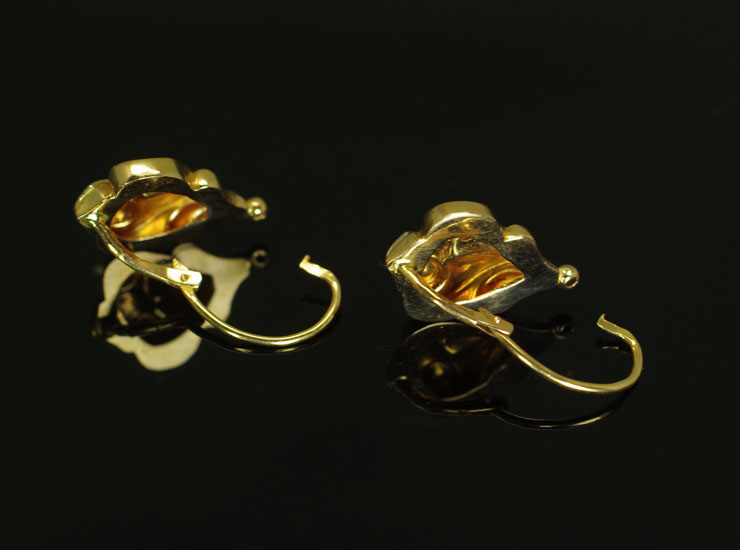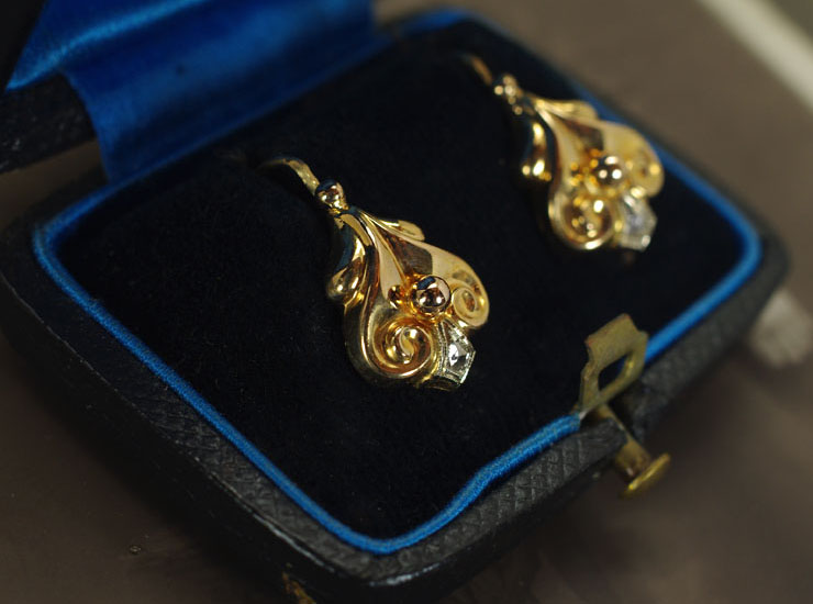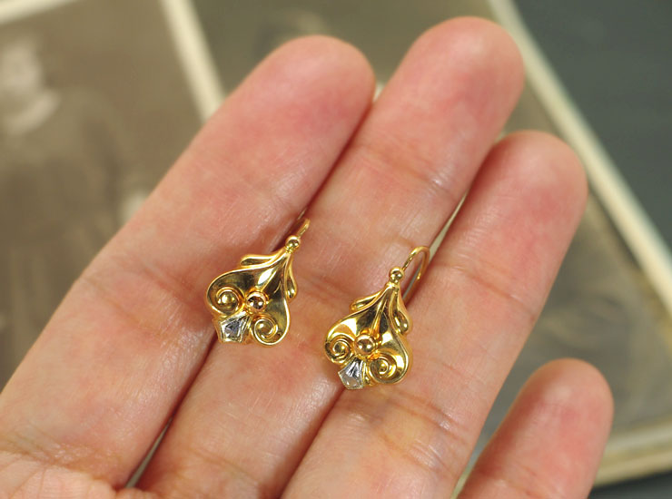地金は18金でややピンクがかった綺麗なゴールドです。モチーフ下の部分のみ18金ホワイトゴールドで、表面にファセットを入れて、宝石のような煌めきが出るよう細工がほどこされています。モチーフは縦12ミリ×横10ミリ。着用時の全体の長さが17ミリ。重量は軽く、着用しているのを忘れるくらいつけ良いつけ心地です。写真でご覧いただけるように、100歳以上とは思えないほど使用感の少ない美しいアンティークピアスです。