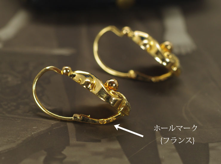 ピアスにフランスの18金のホールマーク(鷲の頭)、メーカーのマーク入り。アンティーク18金ドルムーズピアスは良い状態です。