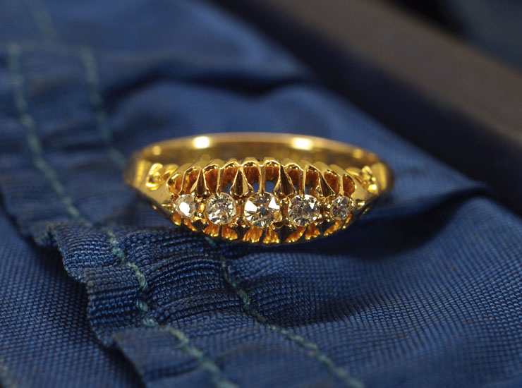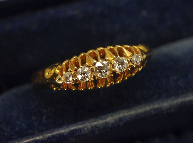 1914年のイギリス製アンティークリングです。ほとばしる光は遠くからでも存在感があります。5石のダイヤが横に並んだアンティークリングはどんなファッションにも合わせやすく、ひっかかりも少なくて使いやすいため、Ringieでは良いものを見つけた時は必ず入手して毎日の定番ジュエリーとしてお客様にお勧めしています。