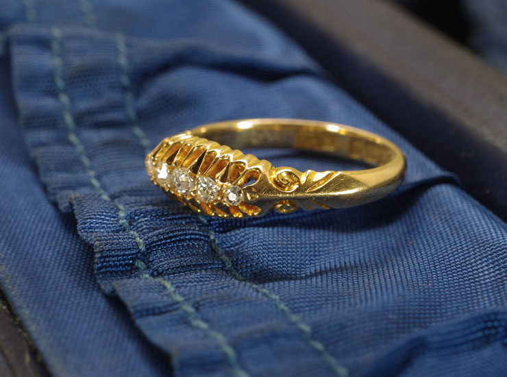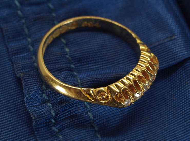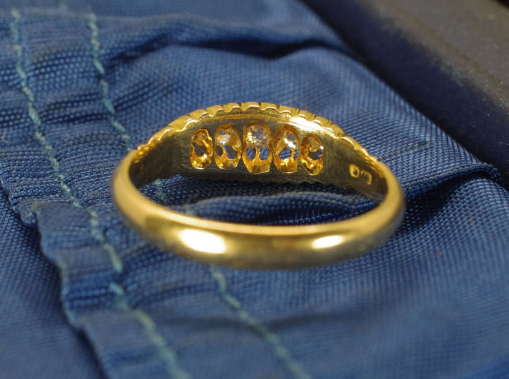 リング内側に18金、1914年を示すイギリスのホールマーク(刻印)入り。アンティーク18金ダイヤ5石リングは良い状態です。