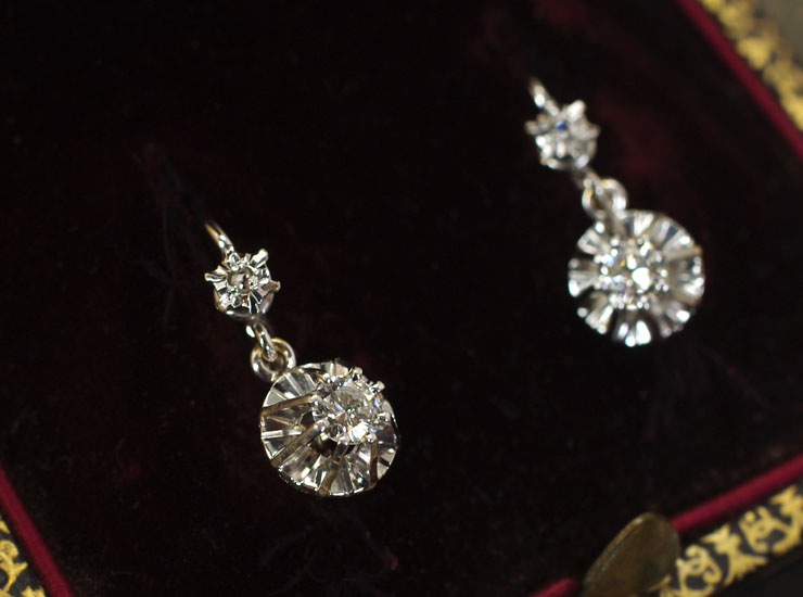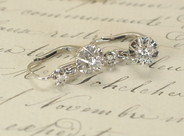 地金は18金ホワイトゴールド。このタイプのフランスのアンティークピアスはイエローゴールドとホワイトゴールドの2色のものが多いのですが、こちらのピアスはすべてホワイトゴールドです。下のダイヤが揺れる作りになっていて、動作に合わせて小刻みに揺れ最大限に光を反射します。キラキラと輝くダイヤはレフ板のようにお顔を明るく見せてくれる効果があります。ピアスは留め具が上下に開閉するレバーバックタイプ。どこから見ても美しいアンティークダイヤピアスです。