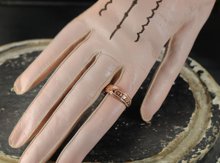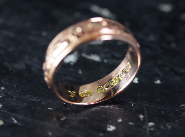 1917年のイギリス製アンティークリングです。美しい花と葉の模様がリング一周施されています。幅は5.5ミリとやや幅広のデザイン。地金は9金。程良いボリュームもあり重厚感が感じられますが、ピンクを帯びた明るいゴールドの色合いがとても綺麗で、実際に身に着けるとエレガントで女性らしい雰囲気です。模様の摩耗も少なく約100歳とは思えない程美しい状態です。全体に模様が入っているためサイズのお直しはできません。