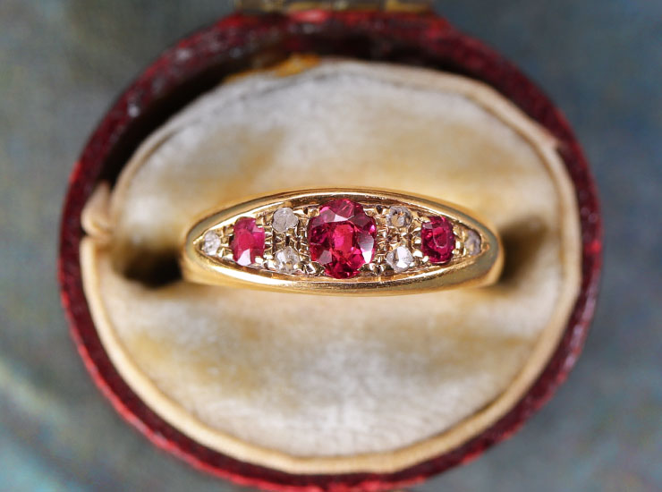 1902年のイギリス製アンティークリングです。くっきり鮮やかな赤色のルビー3石と小さなラフなカットのダイヤ6石が留められた美しいリングです。左のルビー(掲載写真で矢印で示した部分)に小さなカケと真ん中のルビーの端に小さな傷があるため、半分以下の価格でご提供させていただきます。肉眼ではまったく確認できない程の小さなカケと傷ですので、気軽に普段使いできるアンティークリングをお探しの方にお勧めです。