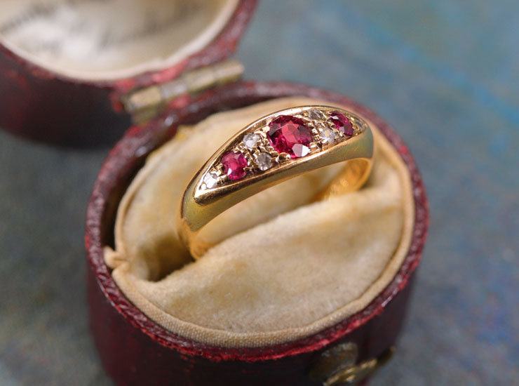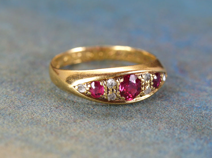 リングに18金、1902年を示すイギリスのホールマーク(刻印)入り。ルビーに肉眼では確認できない程度の小さなカケと傷がありますが、全体的に良い状態です。※こちらの商品はレターパックプラスでお届けいたします。お届け日時のご指定ができませんので、あらかじめご了承ください。