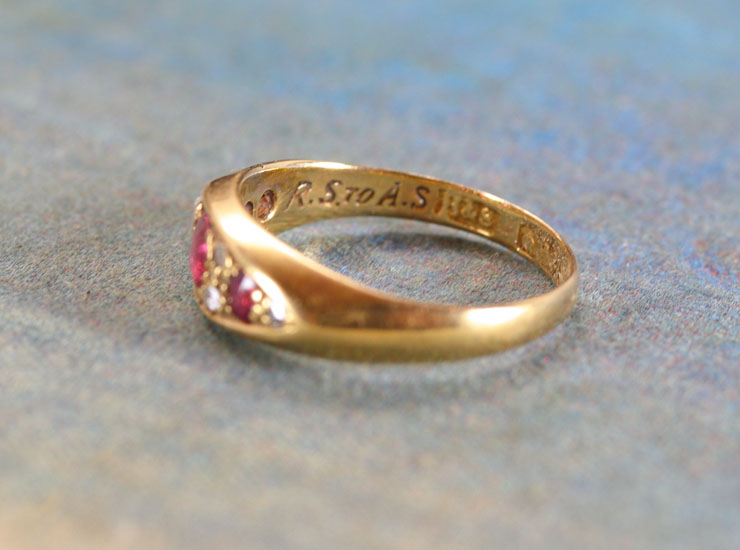 地金は18金。リングは婚約指輪または恋人へ贈られたリングだったようで、リングの内側に「R.S to A.S」(R.SからA.Sへ)とメッセージが刻まれています。8.5号と小さなサイズですので、おそらく左手薬指に着けていたのでしょう。小ぶりでも暗さなのない鮮やかなルビーの美しいアンティークリングです。