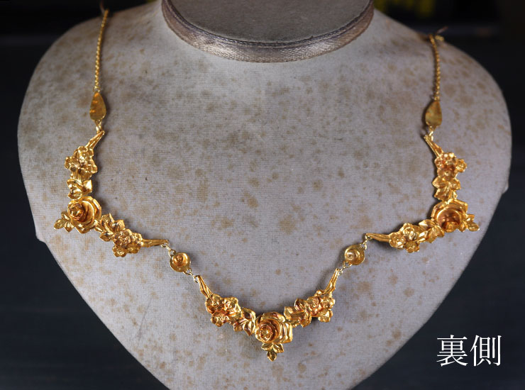 地金は18金。長さは40センチ。大きなパーツ30ミリ〜33ミリ。重量5.2グラム。見た目ではずっしりと重そうですが、裏から打ち出して立体的に模様を浮かび上がらせた作りのため重くありません。チェーンが細みで、薔薇モチーフが程良く垂れ下がるよう計算された作りになっています。元々付いていた引き輪(留め具)の開閉部分のバネが少し緩くなっていたため、不安なくご使用いただけるよう引き輪のみ新品(18金)に交換しています。繊細な金細工の素晴らしいアンティークネックレスです。