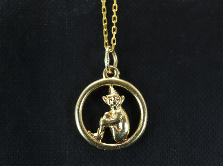 1973年のイギリス製ヴィンテージチャームです。とんがり帽子をかぶり、とんがりブーツをはいたピクシーと呼ばれる妖精です。ピクシーはイギリスで古くから伝わる妖精の一種で、旅人を道に迷わせたりいたずらが大好きだが、友達になった人間を助けるとも言われています。怖可愛い容姿で描かれることが多いピクシーですが、こちらのチャームのピクシーもちょっと怖いですが、ニッと笑った顔がなんとも可愛らしいです。地金は9金。