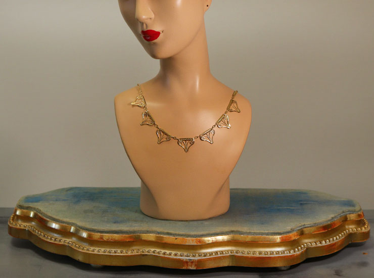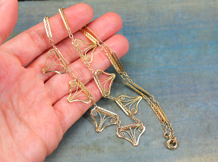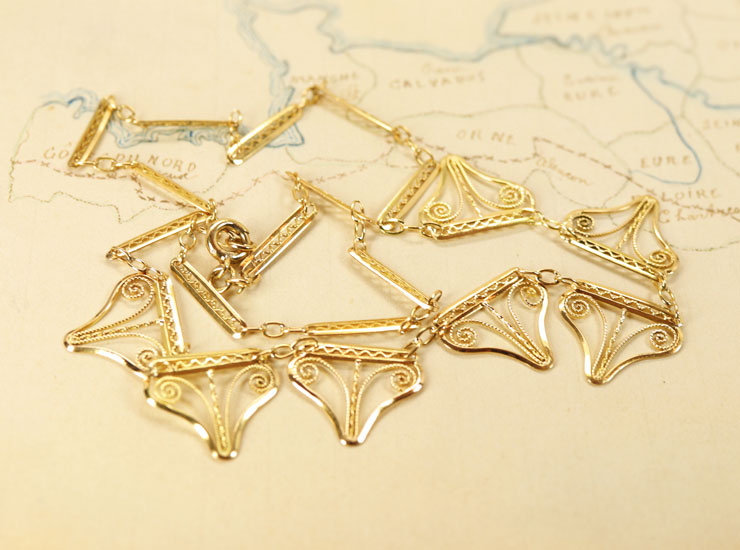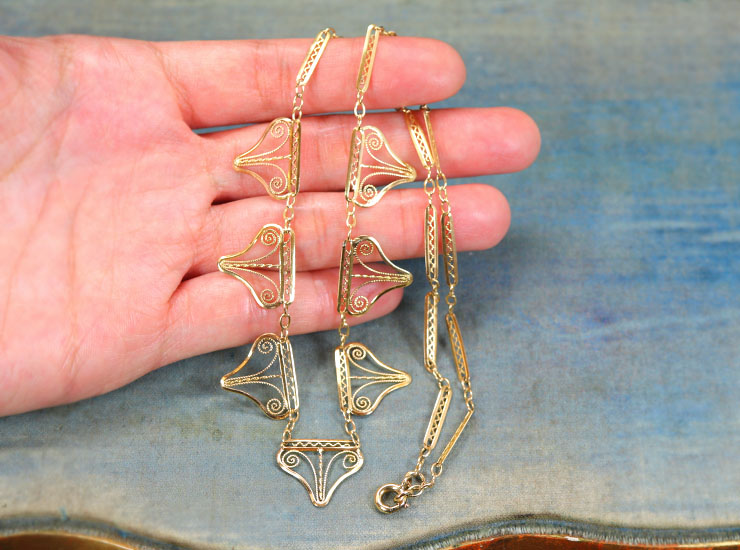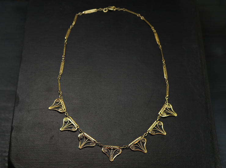 1910年頃のフランス製アンティークネックレス。金線細工(フィリグリー)の上品で華やかなネックレスです。逆しずく型のパーツは大きめ(縦15ミリ×横17ミリ)で、金で作られたレースのように美しくデコルテに広がります。ネックレスの表と裏は同じ模様になっています。