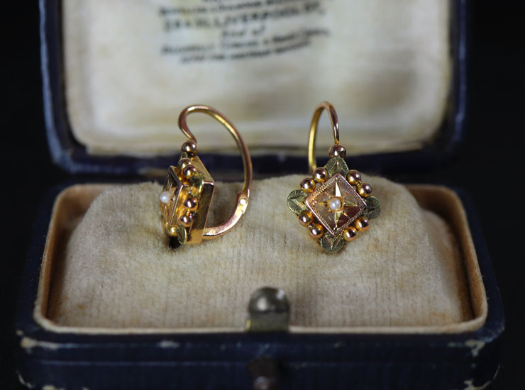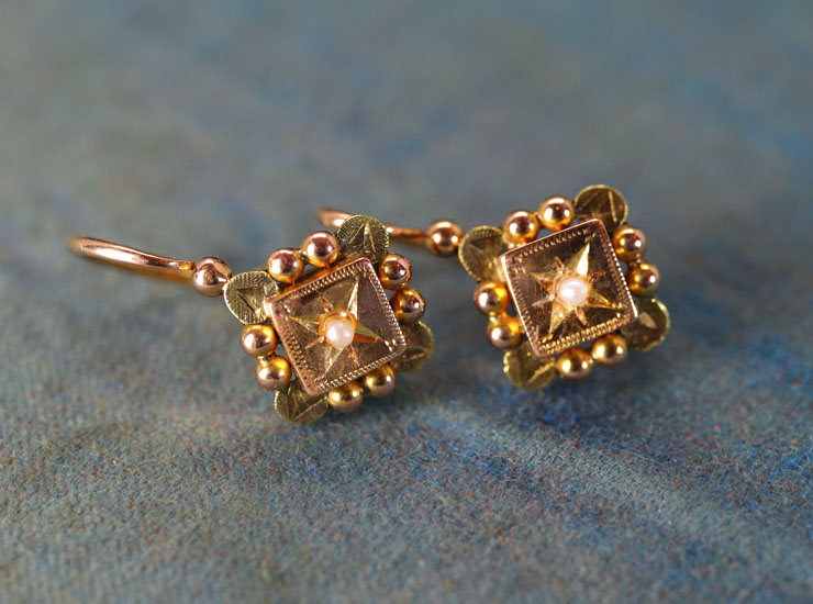 1890年頃のフランス製アンティークピアスです。四角のモチーフに極小のシードパールが留められた可愛らい繊細なデザイン。耳のホールの後ろから通して前のフックに引っかけて留めて着用するドルムーズピアスと呼ばれるタイプのピアスです。ホールの位置にもよりますが、着用するとモチーフ部分が耳たぶのちょうどすぐ下あたりにきて、小さいピアスですが程よい存在感で目を引きます。後ろから通して着用するため、初めてご使用になる方には少し難しいので、少々練習が必要になるかと思います。