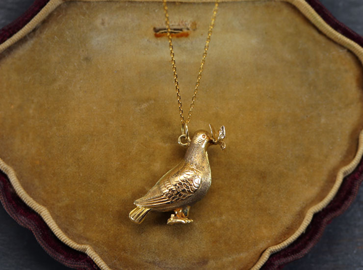 1976年のイギリス製ヴィンテージチャーム・ペンダントです。ぷっくり可愛らしい鳩がオリーブの葉を口ばしにくわえています。平和のシンボルと言われるのには旧約聖書のノアの方舟のエピソードに由来しています。方舟で大洪水が収まるのを待っていたノアは、鳩を放ちます。鳩がオリーブの葉をくわえて戻ってきたのを見て、水が引いて再び大地が蘇ったことを知ります。