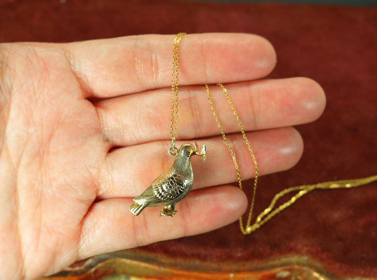 地金は9金。中が空洞のタイプで軽量ですが、手で持った感じもしっかりしていて脆くありません。ミニチュアのフィギュアのように立体的で、羽毛は繊細に象られ、柔らかなオリーブの若葉まで寧丁に仕上げられた上質なチャームです。Ringieではかなりの数のヴィンテージゴールドチャームを扱ってきましたが、こちらのチャームはなかなか見つからないレアなチャームです。幸運を運んでくれそうな可愛らしい鳩です。