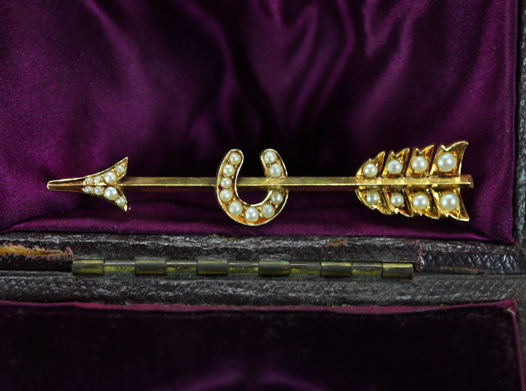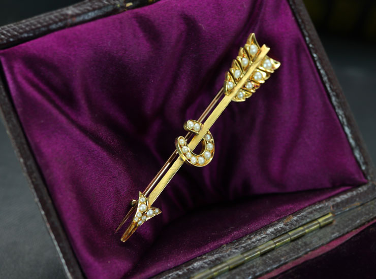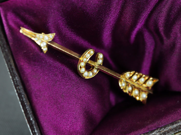 ヴィクトリアンK18シードパールホースシュー&矢ブローチ