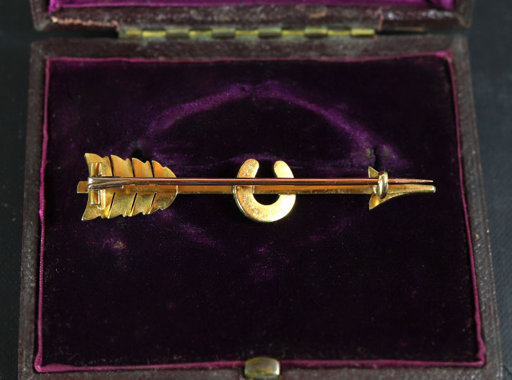 ブローチに刻印が入っていませんが、ゴールドテスターにて18金と確認済み。ヴィクトリアンK18ホースシュー&矢ブローチは良い状態です。