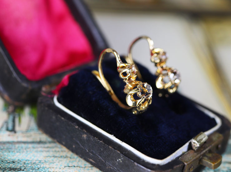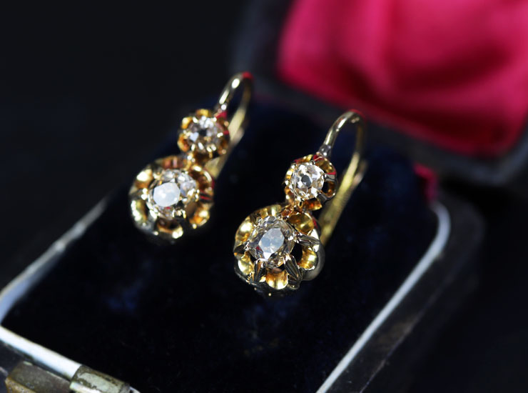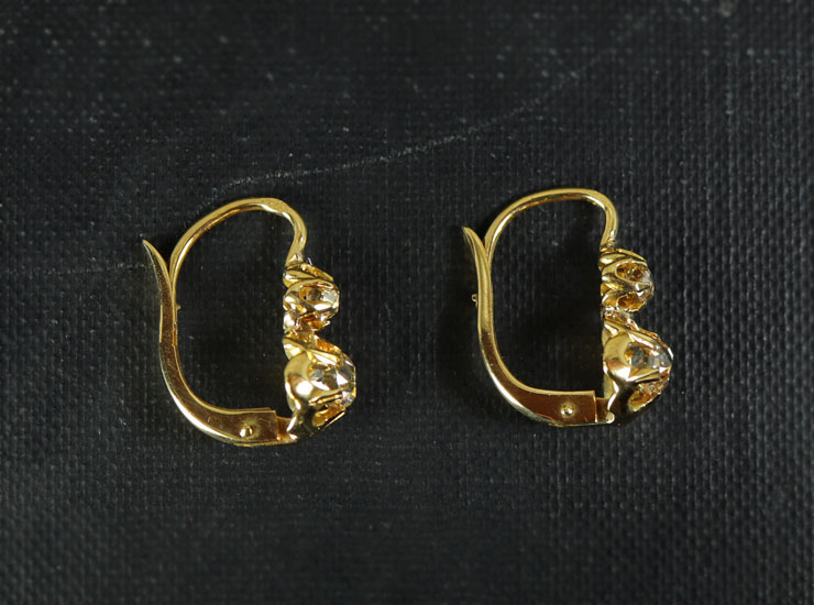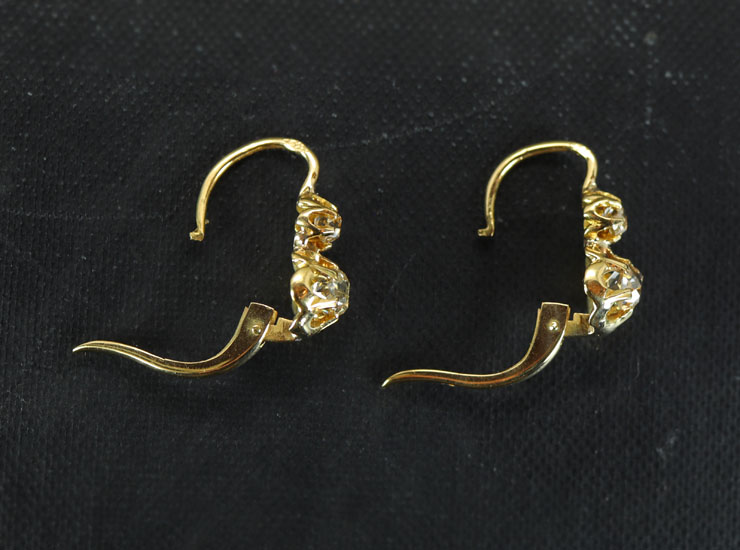 地金は18金イエローゴールド。この時代のフランス製ピアスは一部にプラチナやホワイトゴールドが使用されているものが多く、すべてイエローゴールドというのはなかなかありません。留め具はレバーバックタイプ。大変美しいアンティークダイヤピアスです。