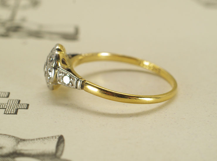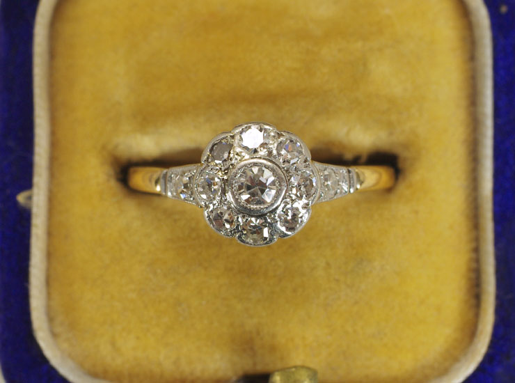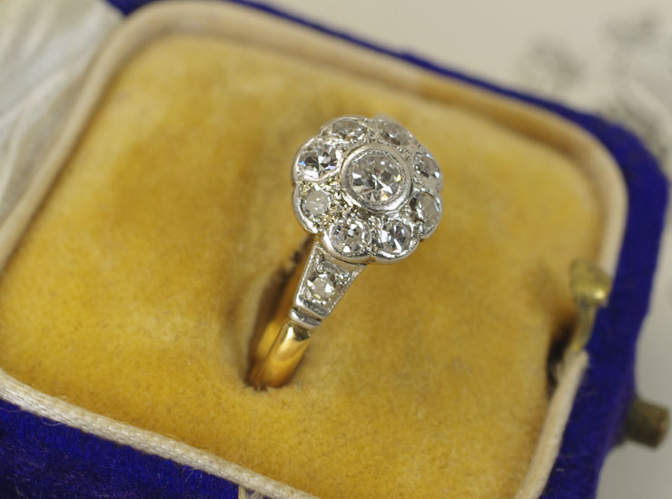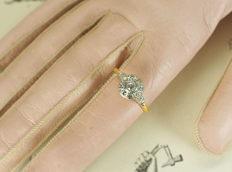 1930年頃のイギリス製アンティークリングです。真ん中のダイヤをさらにダイヤがぐるりと囲んだ花のような形状で、クラスターリングと呼ばれるデザインです。両サイドにもダイヤがセットされ、合計11石のダイヤが使用されています。ダイヤはすべてシングルカット。少し暗い色合いのダイヤが一石含まれています。アンティークの場合、現代のジュエリーのようにすべてが均一ではなく、不揃いの石が使用されることが多々あります。