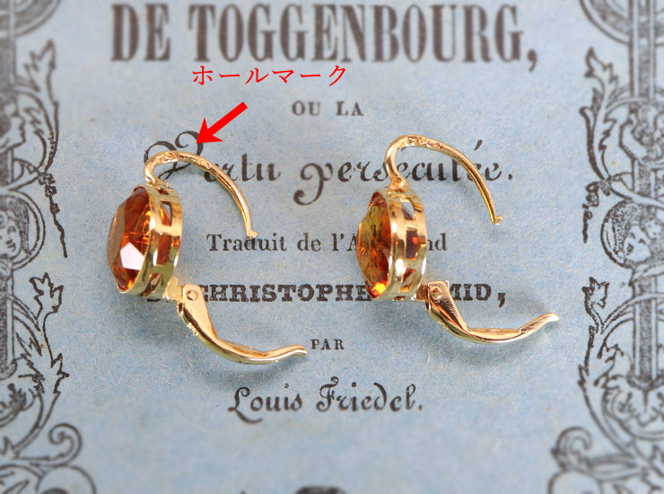 ピアスにフランスの18金を示すホールマーク(鷲の頭)、メーカーのマーク入り。上下に開閉する留め具のみ新品(18金)に交換済み。アンティーク18金シトリンピアスは良い状態です。