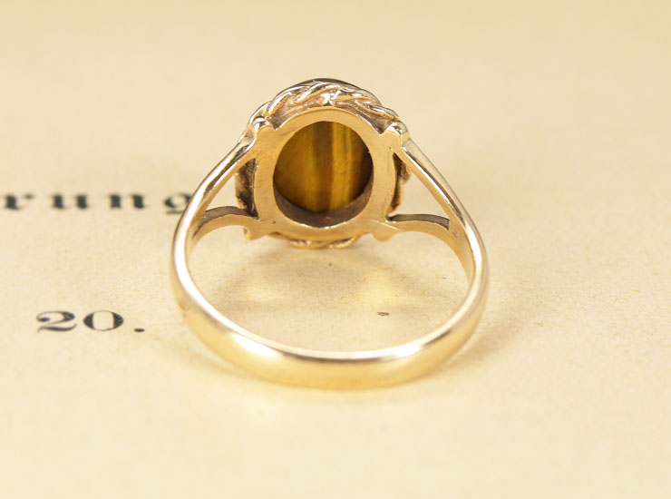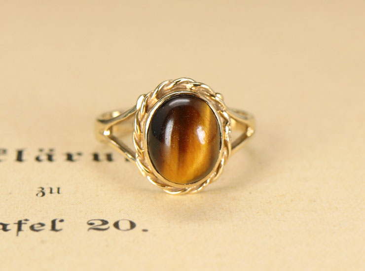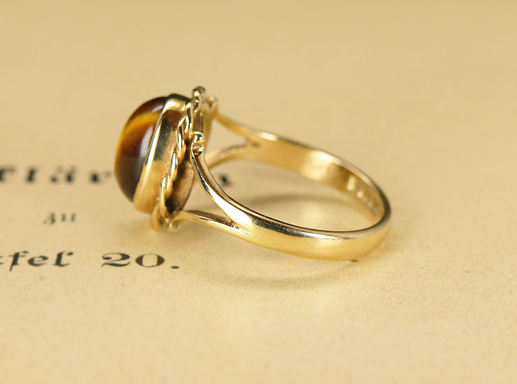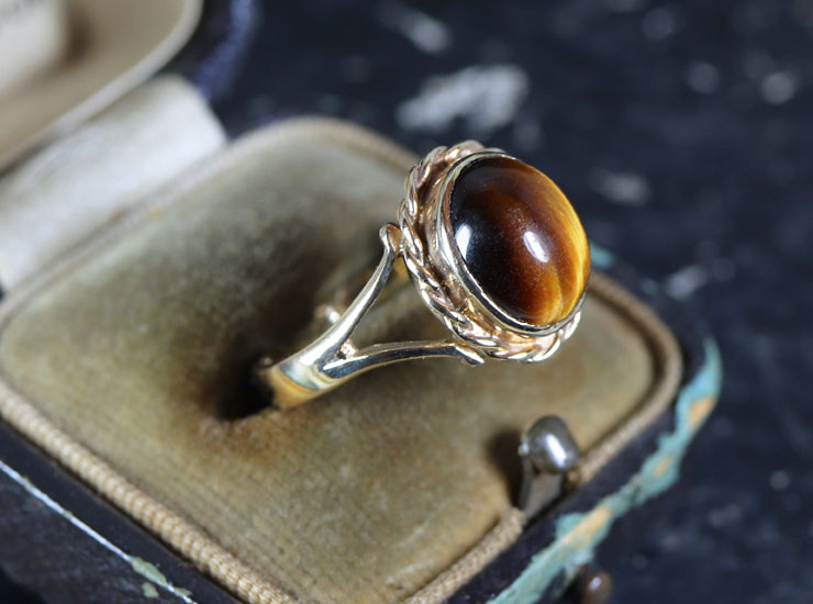 リングに9金、1977年を示すイギリスのホールマーク(刻印)入り。ヴィンテージ9金タイガーアイリングは良い状態です。