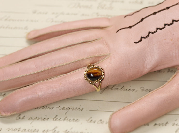 1977年のイギリス製ヴィンテージリングです。ツルリと光沢のある美しいタイガーアイが一石。70年代のレトロなスタイルで、人差し指や中指にはめても存在感がありますが、シックな色合いの石ですので主張しすぎず日常的に使いやすいヴィンテージリングです。地金は9金。タイガーアイのサイズは10ミリ×8.5ミリ。