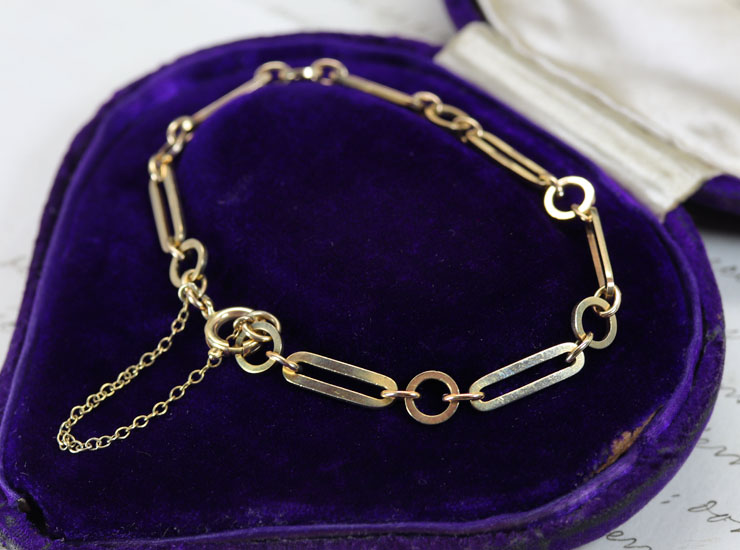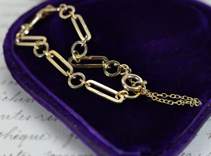 1966年のイギリス製ヴィンテージブレスレットです。丸いリンクと細長いリンクが交互に配置されたデザインです。地金は9金イエローゴールド。チャームをお持ちでしたらチャームを取り付けてご使用いただいても素敵だと思います。もちろん何も付けずそのままでも程良いボリュームがありお洒落です。