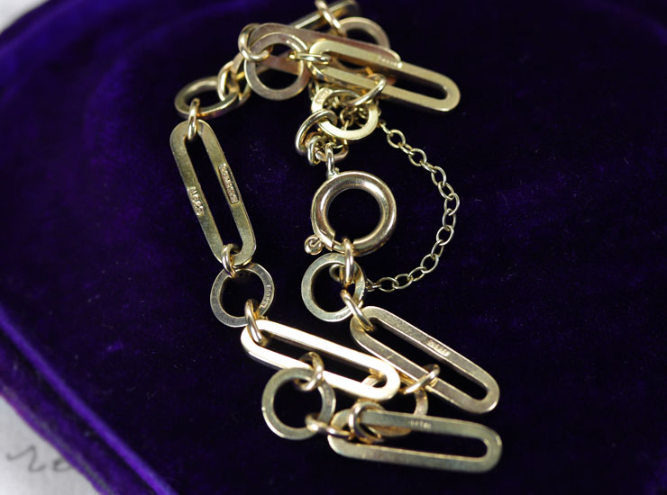 ブレスレットに9金、1966年を示すイギリスのホールマーク(刻印)入り。ヴィンテージ9金ブレスレットは良い状態です。